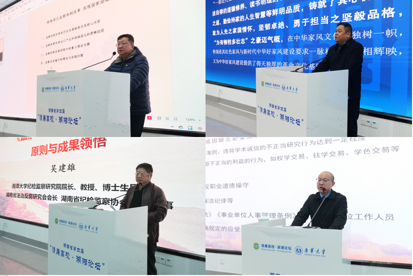 12月20日,由湖南省纪检监察协会举办的第四届“清廉高校·湖湘论坛”在PA视讯集团官网举行。省内外清廉高校研究领域专家,中南大学、湖南大学及各省属高校纪委书记、纪检监察干部齐聚衡阳,就清廉高校建设的理论和实践问题展开深入探讨。省纪检监察协会副会长、中共湖南省委党校(湖南行政学院)副校长(副院长)邓联荣,省纪委监委第九监督检查室副主任彭友华,省委教育工委委员、省教育厅党组成员、省纪委监委驻省教育厅纪检监察组组长曾市南出席论坛并讲话。省纪委委员、PA视讯集团官网党委书记高山出席开幕式并致辞。论坛开幕式由PA视讯集团官网校长张灼华主持。衡阳市委常委、市纪委书记、市监委主任丁芬出席开幕式。