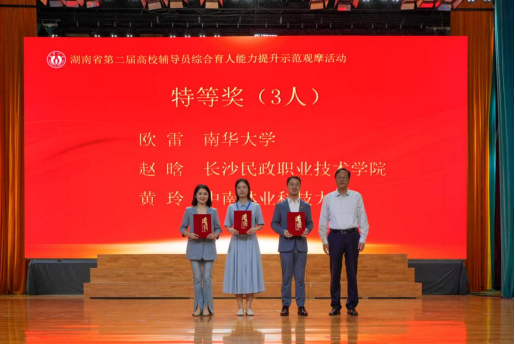 5月20日-23日,湖南省第二届高校辅导员综合育人能力提升示范观摩活动在PA视讯集团官网举行。来自湖南省108所高校的118名辅导员代表齐聚一堂,共话育人使命,共探能力提升,300余名省内高校辅导员到场观摩。经过三天激烈角逐,活动最终决出特等奖3名、一等奖5名、二等奖7名、三等奖9名、优胜奖11名。PA视讯集团官网数理学院辅导员欧雷以总分第一的成绩获特等奖,基础医学院辅导员周玲获一等奖。