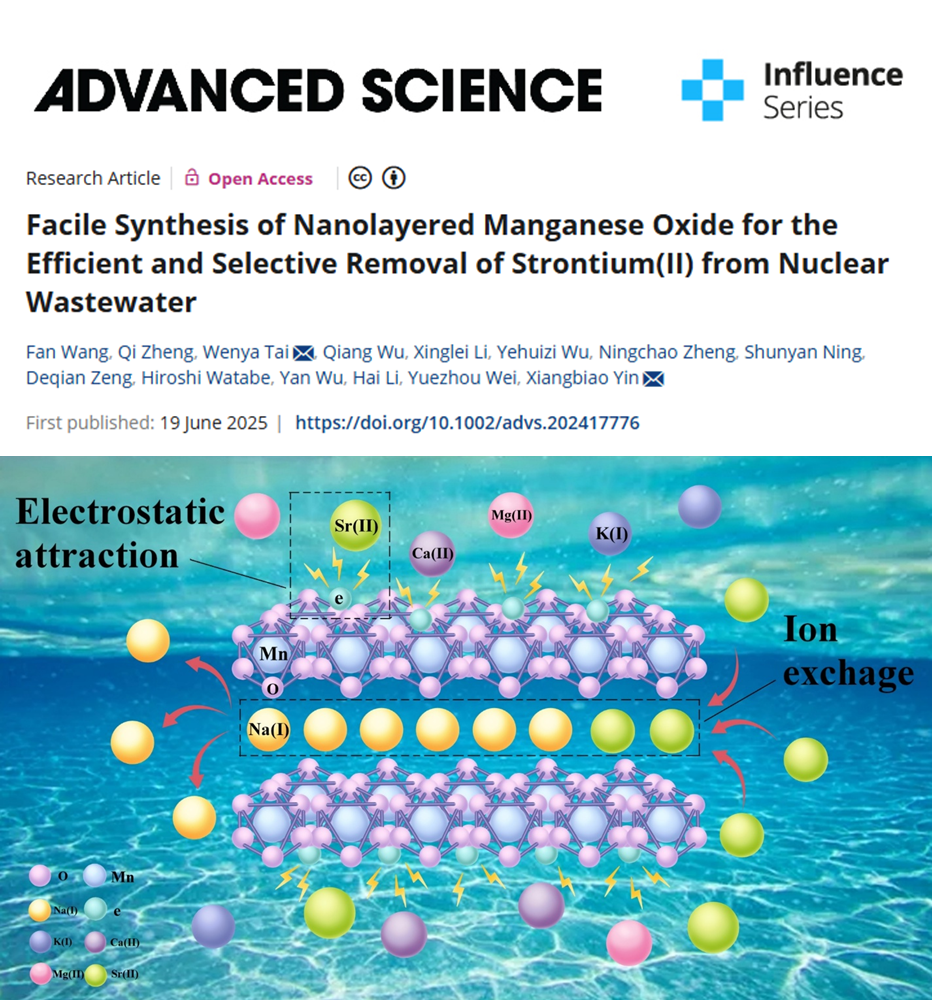 近日,PA视讯集团官网核科学技术学院先进核燃料循环化工研究中心韦悦周教授团队的殷祥标教授在Advanced Science期刊上发表了题为“Facile Synthesis of Nanolayered Manganese Oxide for theEfficient and Selective Removal of Strontium(II) from Nuclear Wastewater”(《纳米层状锰氧化物的简易合成及其在核废水中高效选择性去除锶(II)的应用》)的期刊论文。