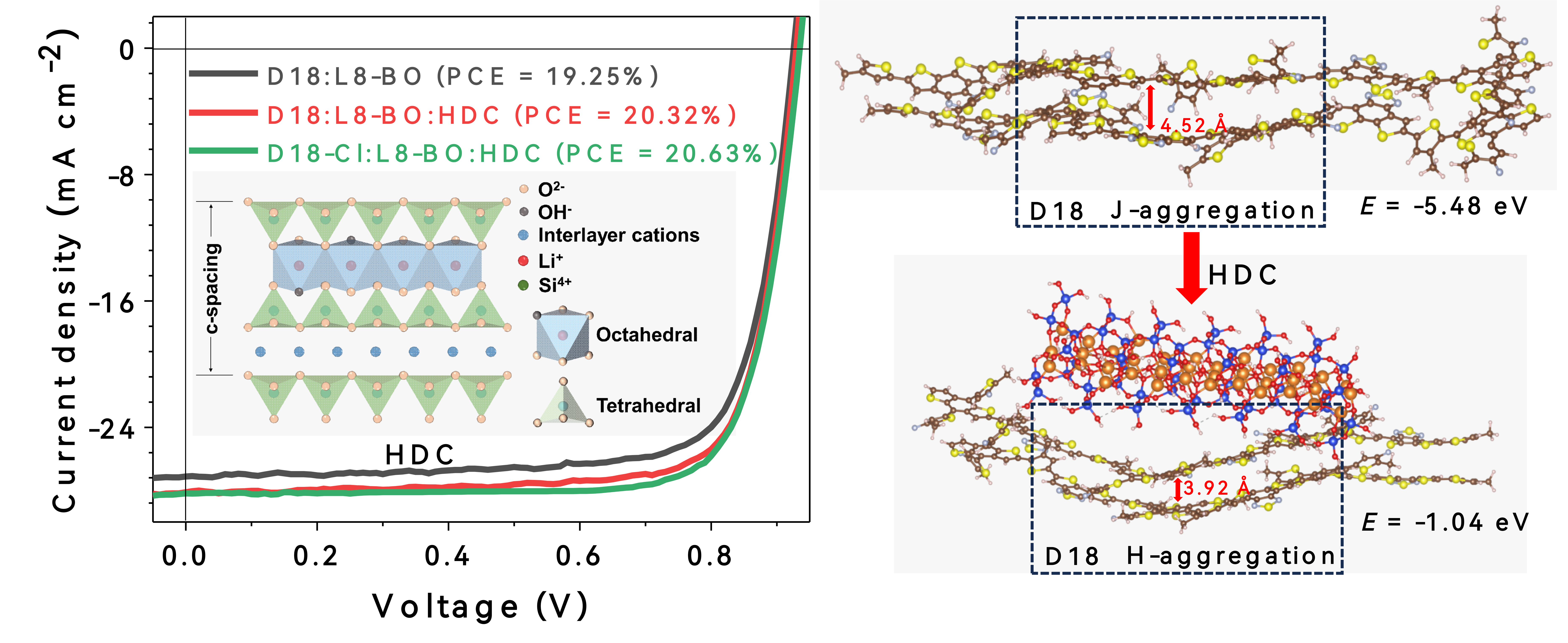 在有机太阳能电池中,给体与受体分子在“体异质结”结构中的排列方式(分子聚集特性)是决定器件性能的核心。然而,聚合物侧链带来的空间位阻,往往导致分子堆积结构连贯性降低,形成不利于高效光电转换的亚稳态构型,成为提升电池效率的关键瓶颈。针对这一挑战,李振业教授团队提出了一种巧妙的形貌调控策略:将二维层状水滑石纳米晶体引入给体-受体体系。通过水滑石表面羟基的定向配位作用,该团队成功调控了聚合物的吸附过程。这一方法有效延长了聚合物给体的π-π共轭相干性,增强了其结晶度。具体表现为:水滑石集成后的给体相呈现出显著的“H聚集”效应,分子排列更紧密有序,长程晶体结构显著改善。这些纳米尺度的结构优化带来了卓越的电荷传输性能:载流子迁移率提高,复合损失被有效抑制。最终,基于该策略制备的水滑石纳米晶掺杂有机太阳电池不仅实现了20.63%的光伏效率,更展现出在多种给体-受体体系中的优异普适性。此项工作不仅提供了一种高效的晶体工程方法,实现了纳米级形貌与电荷传输网络的协同优化,更重要的是,为大幅提升有机太阳能电池的光伏性能开辟了一条全新的技术路径,具有重要的科学意义和应用前景。