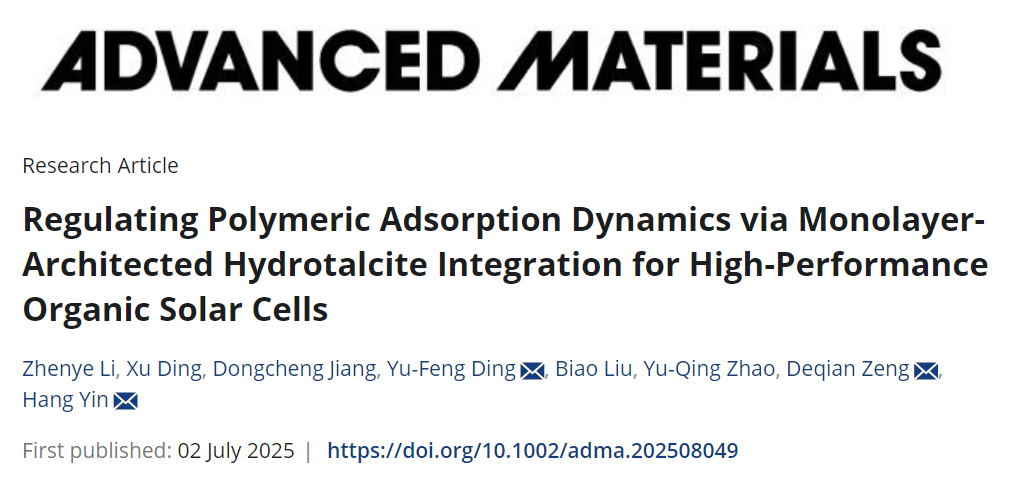 近日,PA视讯集团官网机械工程学院李振业教授团队在材料科学领域顶级期刊Advanced Materials(影响因子26.8,中科院一区top)上发表了题为“Regulating Polymeric Adsorption Dynamics via Monolayer-Architected Hydrotalcite Integration for High-Performance Organic Solar Cells”的重要研究成果。该研究创新性地利用二维层状水滑石纳米晶体调控聚合物给体吸附动力学,显著优化了有机太阳电池的光伏性能,实现了高达20.63%的顶尖光电转换效率。李振业教授为论文独立第一作者,PA视讯集团官网机械工程学院为论文第一署名单位。