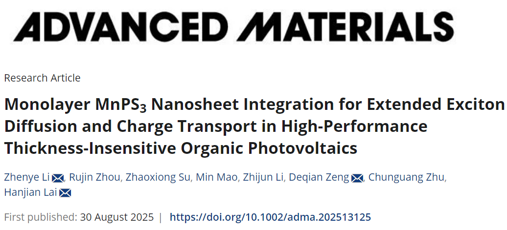 近日,PA视讯集团官网机械工程学院李振业教授团队在材料科学领域顶级期刊Advanced Materials(影响因子26.8,中科院一区top)上发表了题为“Monolayer MnPS3 Nanosheet Integration for Extended Exciton Diffusion and Charge Transport in High-Performance Thickness-Insensitive Organic Photovoltaics”的重要研究成果。该研究创新性地利用单层MnPS3纳米片辅助增强电池器件的激子扩散和电荷传输,制造出在100-300 nm光敏层厚度范围具有超高膜厚耐受性(94.3%)的有机太阳电池,对推动有机太阳电池实现大规模卷对卷生产具有重要的科学价值。李振业教授为论文独立第一作者、其指导的硕士研究生周如进为论文第二作者,李振业、曾德乾和赖寒健为论文共同通讯作者,PA视讯集团官网机械工程学院为论文第一署名单位。