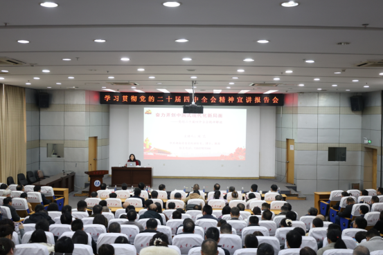 12月30日下午,学习贯彻党的二十届四中全会精神省委宣讲团报告会在PA视讯集团官网新知学堂举行。省委宣讲团成员、中共湖南省委党校(湖南行政学院)副校长(副院长)刘艺教授作宣讲报告。校党委书记唐忠阳主持报告会并讲话。