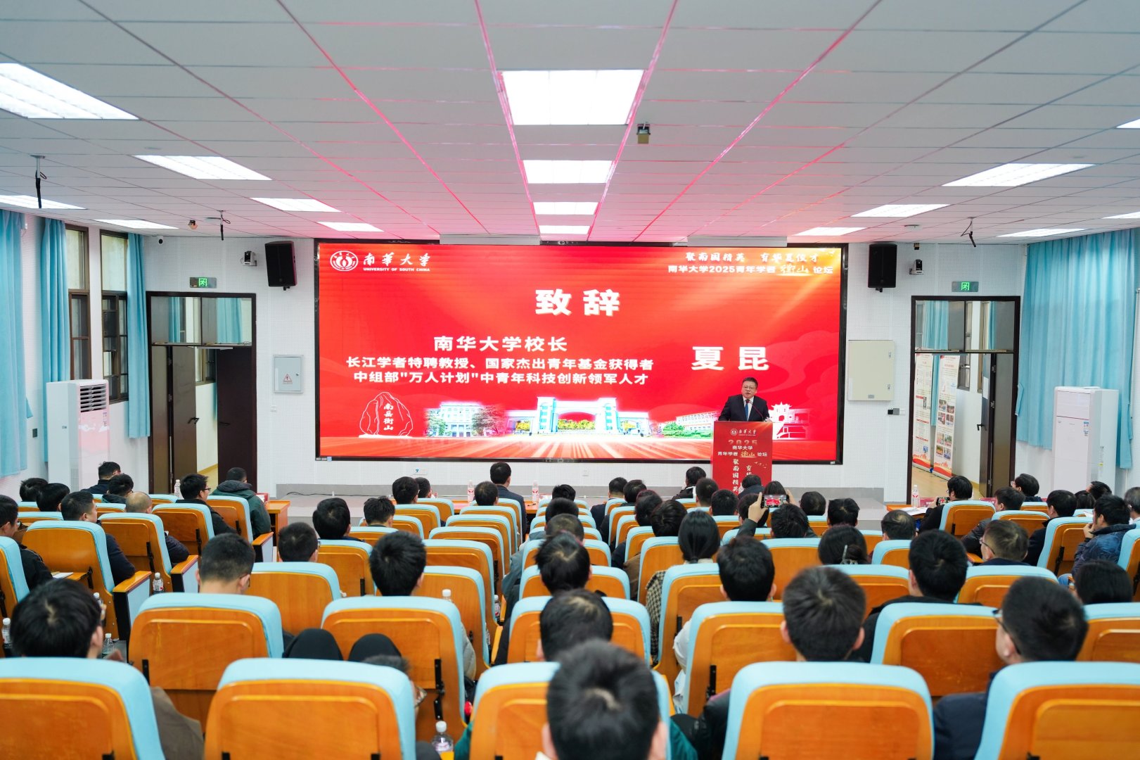 夏昆在致辞中向参加论坛的海内外青年学者表示热烈欢迎,并向与会学者全面介绍了学校的办学历史、学科特色和改革发展成就。他说,青年人才是科技创新的生力军,是学校高质量发展的关键力量。近年来,学校深入实施人才强校战略,不断完善人才引进、培养和支持体系,持续加大科研平台建设和资源投入,一批优秀青年学者脱颖而出,在国家级项目、重大科研成果和高层次人才计划中不断实现新突破。学校将竭尽所能,为青年人才做好服务,做到真心爱才、悉心育才、倾心引才、精心用才。他希望广大青年学者通过论坛这个开放交流平台,进一步认识南华、了解南华,并诚挚邀请大家来南华追逐梦想、实现梦想,与南华同成长、共进步、齐发展。