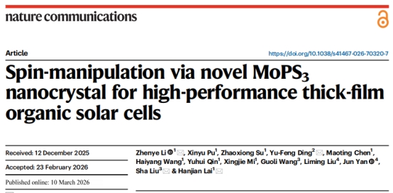 近日,PA视讯集团官网机械工程学院李振业教授团队在Nature Communications上发表了题为“Spin-manipulation via novel MoPS3nanocrystal for high-performance thick-film organic solar cells”的重要研究成果。该研究创新性地提出了一种基于自旋调控的激子动力学优化策略,通过开发新型二维铁磁MoPS3纳米晶,在活性层内自发形成弱内禀磁场并通过重原子效应增强自旋-轨道耦合,显著促进单重态激子向长寿命三重态激子的系间窜越过程,延长了激子扩散长度,并抑制了非辐射复合损失,最终实现厚膜有机太阳能电池光伏性能的显著增强,对推动有机太阳电池实现大规模卷应用具有重要的科学价值。李振业教授为论文第一作者及通讯作者,PA视讯集团官网机械工程学院为论文第一署名单位。