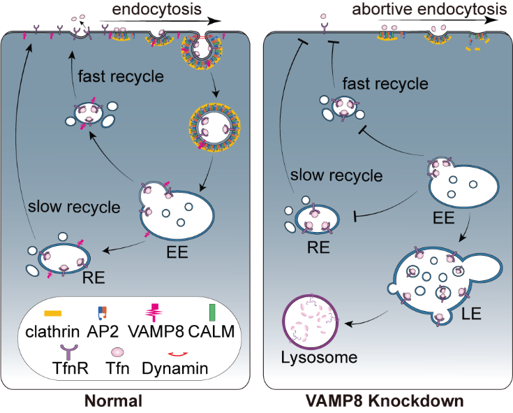 囊泡相关膜蛋白8(Vesicle-Associated Membrane Protein 8,VAMP8)具有调控胞内囊泡循环运输的功能,然而VAMP8所介导的胞内囊泡运输是否参与调控CME过程尚不清晰。陈志明教授团队针对这一关键科学问题开展深入研究,发现VAMP8在调控CCP起始、稳定及内凹中发挥重要功能。进一步机制研究显示,VAMP8并非通过直接被招募到CCV来调控CME,而是通过促进内吞货物(如转铁蛋白受体)在胞内体与质膜之间的循环间接影响CME。