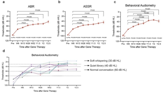 DFNB9型耳聋由OTOF基因突变所致,表现为先天性双侧重度至完全感音神经性耳聋,严重影响患者语言发育与认知功能,全球尚无获批治疗药物。此前,复旦大学附属眼耳鼻喉科医院舒易来教授团队通过多年努力,研发出OTOF耳聋基因治疗药物,于2022年开展全球首个先天性耳聋基因治疗临床试验,成功恢复聋哑患者的听力和言语,发表在顶级医学期刊The Lancet,选为The Lancet封面导读并获同期国际专家点评;并于Nature Medicine等发表双耳临床治疗结果。不过该单中心研究样本量相对小,随访时间为半年到1年。