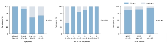 研究团队通过深入分析,探究了影响OTOF基因治疗效果的相关因素:年龄、基线畸变产物耳声发射(DPOAE)引出情况和OTOF突变类型。研究发现,0.5–18岁未成年受试者的治疗有效性以及听力改善程度优于18岁以上受试者,其中0.5–3岁低龄儿童的治疗有效率达100%,3–8岁儿童达92%,8–18岁青少年达60%。治疗前基线DPOAE引出情况可预测治疗效果。DPOAE是评估耳蜗外毛细胞功能的重要指标,基线时在更多频率引出DPOAE的受试者,治疗后听力恢复效果更优,有望作为预测OTOF耳聋基因治疗效果的重要生物标志物。携带双等位基因非截短突变(NT/NT)的受试者,治疗后行为测听阈值优于携带截短突变(NT/T、T/T)的受试者,但不同突变类型的治疗有效率无显著差异(88%–94%),说明该疗法对不同类型OTOF基因突变类型均适用。