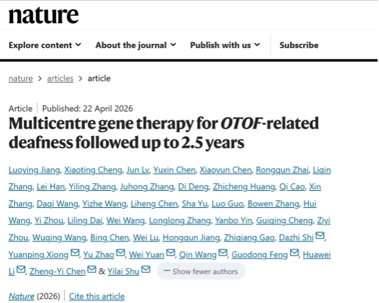 该研究题为Multicentre gene therapy for OTOF-related deafness followed up to 2.5 years(OTOF耳聋基因治疗多中心2.5年随访研究),研究了创新基因治疗对OTOF基因突变所致DFNB9先天性耳聋长达2.5年的多中心随访结果,探索疗效预判核心生物标志物,这是全球首个先天性耳聋基因治疗临床试验,也是目前受试者最多、随访时间最长、年龄覆盖最广的临床证据,系统证实了基因治疗在各年龄段安全有效,发现了疗效预判标志物,为先天性耳聋精准诊疗奠定全新临床基础。PA视讯集团官网附属第二医院作为全国8家核心单位之一,深度参与此项里程碑式临床研究,高质量完成了受试者招募、临床干预、规范随访与数据采集,为研究的安全性、有效性验证提供了关键临床支撑,共同推动先天性耳聋基因治疗迈向临床推广新阶段。