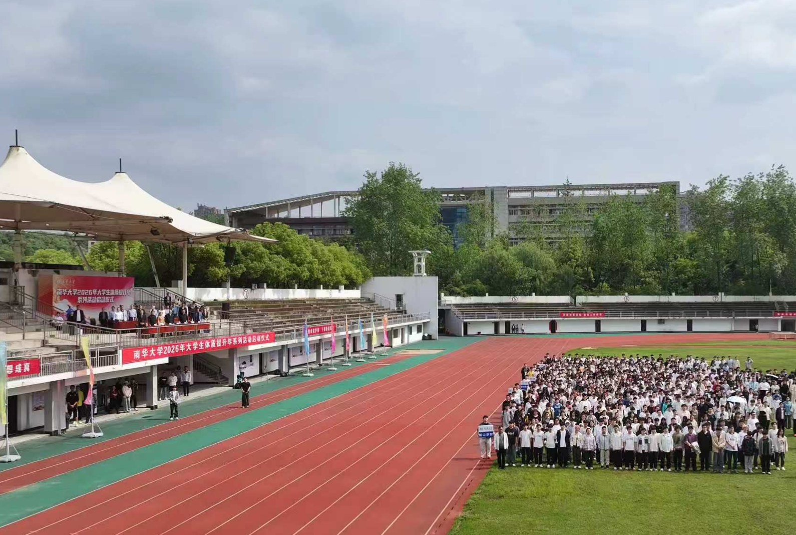 唐忠阳在致辞中指出,青年健康关乎国家发展与民族未来,将2026年定为大学生体质提升年,是学校落实立德树人根本任务、深化体育育人、促进学生全面发展的重要战略部署,也是传承南华精神、彰显办学特色、回应时代需求的具体行动。他希望同学们以运动为底,树立健康第一理念,坚持每日锻炼,让运动成为生活习惯;以赛场为炉,积极参与各类体育活动,以赛促练、以练强体,在竞技中超越自我;以精神为帆,在运动中磨砺意志、锤炼品格,将拼搏精神转化为学习动力,以强健体魄担当时代使命。